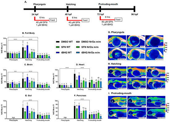 (A) Zebrafish were treated with 40 µM SFN or 1 µM tBHQ during the pharyngula, hatching, and protruding-mouth stages for 6 h and then fixed, and Nrf2a protein was labeled using immunohistochemistry (IHC). The mean fluorescence intensity (FI) of Nrf2a protein in the (B) body tissue, (C) brain, (D) heart, (E) gut, and (F) pancreas was measured; liver data are presented at higher magnification in Figure 3 below. Representative heatmaps were generated to visualize Nrf2a protein fluorescence differences at the (G) pharyngula, (H) hatching, and (I) protruding-mouth stages. The gut and pancreas are not present (n.p.) at the pharyngula stage. Statistics were performed with a two-way ANOVA and Fisher’s LSD post hoc test. n = 7–12 fish. Letters indicate significant differences (p ≤ 0.05) among groups. * p ≤ 0.05, *** p ≤ 0.001, **** p ≤ 0.0001. Scale bar = 100 µm.