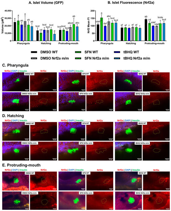 (A) Zebrafish were treated with 40 µM SFN or 1 µM tBHQ during the pharyngula, hatching, or protruding-mouth stage for 6 h and then fixed, and Nrf2a protein was labeled using immunohistochemistry (IHC). Z-stacks of the islet were acquired via confocal microscopy. (A) Islet volume and (B) islet mean fluorescence intensity (FI) of Nrf2a protein were measured with Nikon NIS elements software (available at Light Microscopy Core analysis workstations at the UMass Amherst Institute for Applied Life Sciences; https://www.microscope.healthcare.nikon.com/bioimaging-centers/nic-and-cofe/university-of-massachusetts-amherst). Representative images of each group at the (C) pharyngula, (D) hatching, and (E) protruding-mouth stage are shown. Images show max intensity projections of the islet Z-stack (circled in yellow) where FITC (green) represents β-cells, TRITC (red) represents Nrf2a protein, and DAPI (blue) represents nuclei. Statistics were performed with a two-way ANOVA and Fisher’s LSD post hoc test. n = 5–12 fish. Letters indicate significant differences (p ≤ 0.05) among groups. Scale bar = 25 µm.