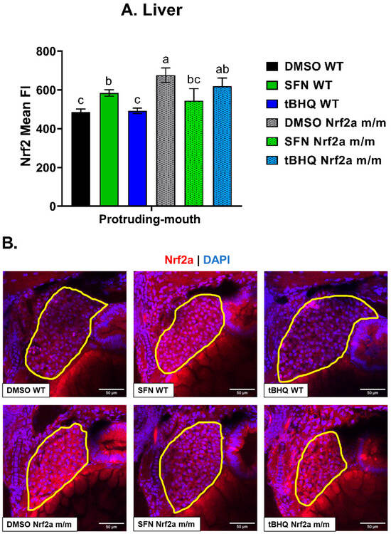 Zebrafish were treated with 40 µM SFN or 1 µM tBHQ during the protruding-mouth stage for 6 h and then fixed, and Nrf2a protein was labeled using immunohistochemistry (IHC). Liver images were acquired using confocal microscopy. (A) The mean fluorescence intensity (FI) of labeled Nrf2a protein in the liver was quantified via image analysis. (B) Representative images of the zebrafish liver are shown, where the liver is outlined in yellow, TRITC (red) represents Nrf2a, and DAPI (blue) represents nuclei. Statistics were performed using a one-way ANOVA followed by Fisher’s LSD post hoc test. n = 8–13 fish. Letters indicate significant differences (p ≤ 0.05). Scale bar = 50 µm.