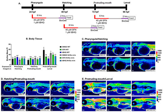 To identify tissues with proteins undergoing S-glutathionylation downstream of Nrf2a activation, we incubated zebrafish embryos with a biotinylated GSH molecule (BioGee). Zebrafish were also treated with 40 µM SFN or 1 µM tBHQ during the pharyngula, hatching, and protruding-mouth stages for 6 h. Unlike the embryos used for Nrf2a expression changes, embryos were then washed and maintained in clean water, and 24 h after exposures began, the embryos were evaluated for downstream impacts on protein-S-glutathionylation. Embryos were incubated in 100 µM BioGee for 2 h and then immediately fixed, and protein S-glutathionylation was labeled via IHC (Figure 5A). The mean fluorescence intensity of protein S-glutathionylation was increased in the body tissue (Figure 5B) in embryos in the protruding-mouth/larval stage by 150% and 207% in the control WT group compared with the embryos in the pharyngula/hatching and hatching/protruding-mouth stages, respectively. Only with exposure to Nrf2 activators during the protruding-mouth stage did SFN and tBHQ in the WT embryos decrease protein S-glutathionylation at the larval stage by 45% and 58%, respectively. The control Nrf2a m/m embryos at the larval stage had lower protein S-glutathionylation by 22% compared with the control WT embryos. tBHQ exposure during the protruding-mouth stage in the Nrf2a m/m embryos also had decreased protein S-glutathionylation by 26% compared with the control Nrf2a m/m embryos at the larval stage. Representative heatmaps showing differences in BioGee labeling in the embryos are shown in Figure 5C–E.