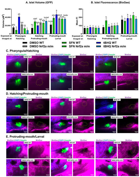 Zebrafish were treated with 40 µM SFN or 1 µM tBHQ for 6 h during the pharyngula, hatching, and protruding-mouth stages and incubated with BioGee for 2 h before fixation 24 h after the start of the exposure. BioGee protein conjugates were labeled in situ using IHC. Confocal microscopy was used to acquire Z-stacks of the islet. (A) Islet volume and (B) islet mean fluorescence intensity (FI) of BioGee. Representative images at the (C) pharyngula (start of exposure)/hatching (BioGee labeling and fixation), (D) hatching/protruding-mouth, and (E) protruding-mouth/larval stages are shown. Images are max intensity projections of the Z-stack the islet (outlined in yellow), where FITC (green) represents β-cells, TRITC (purple) represents BioGee protein conjugates, and DAPI (blue) represents nuclei. Statistical significance was assessed via two-way ANOVA followed by Fisher’s LSD post hoc test. n = 7–9 fish. Letters indicate significant differences (p ≤ 0.05) among groups. Scale bar = 25 µm.
