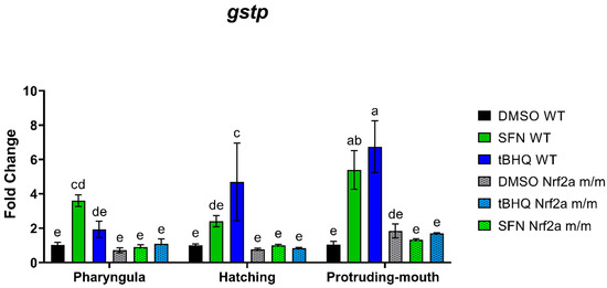 To assess the transcriptional activity of Nrf2a, we used qRT-PCR to measure the expression of gstp as a bioindicator of exposure efficacy and Nrf2a activation expected in the WT but not the m/m embryos. The expression of gstp was increased with SFN and tBHQ exposure in the Nrf2a WT embryos but not the Nrf2a m/m embryos (Figure 8). SFN exposure in the WT embryos during the pharyngula stage increased gstp expression by 2.5-fold compared with the control embryos. Treatment with tBHQ in the WT embryos during the pharyngula stage only slightly increased gstp expression by 87% compared with the control embryos (p = 0.2742). tBHQ exposure in the WT embryos during the hatching stage increased gstp expression by 3.7-fold compared with the control embryos. SFN exposure in the WT embryos during the hatching stage only slightly increased gstp expression by 1.4-fold compared with the control embryos (p = 0.0904). Both the SFN- and tBHQ-exposed WT embryos during the protruding-mouth stage increased gstp expression by 4.2 and 5.5-fold, respectively. The expression of gstp was not altered by exposures in the Nrf2a m/m embryos.