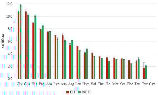 To assess the amino acid profiles of EH and NEH, an HPLC Acquity Arc (Waters Corp, Milford, MA, USA) integrated with a fluorescence detector, Waters 2475 and a Waters AccQ-Tag Amino Acids C18 Column, with a particle size of 3 µm (3.9 mm × 150 mm), was used. Following the procedure described by Lorenzo et al. [41], the hydrolysis was carried out starting from 100 mg of sample and 5 mL of 6 N hydrochloric acid at 110 °C for 24 h; then, 200 mL of distilled water was added to the hydrolyzed solution. The mixture was then filtered through a 0.45 μm filter. As for the derivatization, considering the protocol proposed by Domínguez et al. [42], 10 μL of the abovementioned solution was buffered with AccQ-Fluor borate buffer to pH 8.8 to obtain a total volume of 100 μL, and 20 μL of AcQ-Fluor reagent (3 mg/mL in acetonitrile) was added to initiate the reaction. The injection volume was 10 µL for each sample with a 1.0 mL/min flow rate in a working condition of 37 °C. As recommended by van Wandelen [43], the mobile phases were made starting with Waters AccQ-Tag Eluent A, acetonitrile, and Milli-Q ultrapure water. The detection was accomplished using a fluorescence detector with an excitation length of 250 nm and an emission length of 395 nm. The analyses were carried out in duplicate.