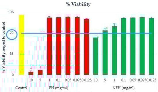 The molecular structures of EH and NEH were evaluated employing Attenuated Total Reflectance–Fourier-Transform Infrared (ATR-FTIR) spectroscopy after recording a preliminary background. Using an FT-IR spectrophotometer (Perkin Elmer, Inc., Waltham, MA, USA), spectra were recorded at room temperature from 4000 to 600 cm−1 at a resolution of 4 cm−1, accumulating 8 scans per sample.