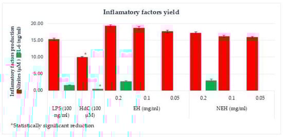 An anti-inflammatory assay uses the murine monocyte–macrophage cell line RAW 264.7 (ATCC TIB-71). Cells were cultured in Dulbecco’s Modified Eagle Medium (DMEM) (ATCC-30-2002) supplemented with 10% heat-inactivated FBS and antibiotic (solution of 10,000 units of penicillin and 10 mg streptomycin/mL) at 1% and maintained at 37 °C and 5% CO2. The anti-inflammatory assay includes a preview determination of cell viability according to the methodology described above which was calculated as % of viability with respect to the control. For each hydrolysate, the highest concentration that does not affect cell viability is selected for the anti-inflammatory assay. The anti-inflammatory capacity of selected concentrations of hydrolysates was evaluated. Exponentially growing RAW 264.7 macrophages were plated in 96-well plates at a density of 2 × 105 cells per well in 100 µL of culture medium, allowing them to adhere overnight. The cells were then stimulated with LPS (100 ng/mL), and the plates were incubated for 30 min in optimal culture conditions. The cells were then treated with positive-control hydrocortisone (100 µM) or samples dissolved in culture medium to the selected concentration for each hydrolysate and incubated at 37 °C, 5% CO2, for 24 h. In the plate, the cells were maintained as the LPS control, without treatment, and media control, without LPS or treatment. Cell-free supernatants were collected and used to measure NO, TNF-α, and IL-6. NO-content was determined by the Griess reaction kit (Invitrogen, Thermo Scientific, Waltham, MA, USA), while enzyme-linked immunosorbent assay (ELISA) kits were used for interleukin 6 and tumor necrosis factor (TNF-α) cytokine determination (IL-6 Mouse ELISA Kit and TNF alpha Mouse ELISA Kit; Invitrogen Thermo Fisher, Waltham, MA, USA). The kits were used following the manufacturer’s recommendations. For nitrites, IL-6, and TNF-α, the percentage of inhibition in the production of inflammatory factors by macrophages was calculated for each treatment group using the following Equation (2):