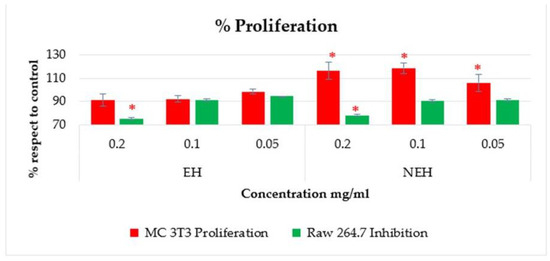 This test is carried out as a prior step to all biological tests to select the maximum sample concentrations that can be used without affecting cell viability, ensuring the reliability of the results obtained in each of the cell lines. Viability was assessed by the well-known MTT test, based on NAD(P)H-dependent cellular oxidoreductase enzymes that can reduce the tetrazolium dye, MTT (3-(4,5-dimethylthiazol-2-yl)-2,5-diphenyltetrazolium bromide), to insoluble formazan. A dimethyl sulfoxide (DMSO) solution is added to dissolve formazan product into a colored solution. The test is performed in 96-well plates, with a volume of 100 µL per well and with different concentrations depending on the cell line: 5 × 105 cells/mL in RAW 264.7 (ATCC TIB-71) and 5 × 103 cells/mL in HepG2 (ATCC® HB-8065™). In practice, after treatment with the test compound for 24 h, 10 μL of 5 mg/mL MTT in PBS was added to each well before the plate was incubated in 5% CO2 at 37 °C for 4 h. Next, the solutions in the well were carefully removed, and 100 μL of DMSO was added to each well and incubated for 20 min. The absorbance of each well was subsequently measured at 570 nm of wavelength by a spectrophotometer (Molecular Devices LLC, USA). Cell viability was expressed as % of viability with respect to the control.