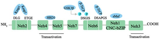 Nrf2, a member of the Cap‘n’collar (CNC)-BZIP family of transcription factors, is a major transcriptional regulator of antioxidant response, controlling the expression of a range of antioxidant proteins, such as heme oxygenase-1 (HO-1), superoxide dismutase (SOD), and glutathione (GSH), to reduce the level of ROS and exert antioxidant effects. Nrf2 contains 605 amino acids and is divided into seven effective Nrf2-ECH homology (Neh) domains (Neh1-7), each with different functions (Figure 1). The Neh1 structural domain contains the bZIP motif, which enables Nrf2 to bind to the antioxidation response element (ARE) sequence. In addition, Neh1 can interact with UbcM2 (E2 ubiquitin-conjugating enzyme) to regulate the stability of the Nrf2 protein. N-terminal Neh2 is a redox-sensitive domain, consisting of seven lysine residues responsible for ubiquitination. The ETGE and DLG motifs of Neh2 are involved in Keap1 binding, which leads to Cullin 3-dependent E3 ubiquitination and proteasomal degradation. The C-terminal Neh3 domain is necessary for Nrf2 transcription activity, and helps Nrf2 to be transactivated through the interaction with the chromogenic ATPase/deconjugate DNA-binding protein (CHD6) [,]. Neh4 and Neh5 domains are rich in acid residues and have been proved to interact with the CH3 domain of the cAMP response element binding protein (CREB) binding protein (CBP), which is essential for the Nrf2-mediated transactivation of ARE []. The redox-insensitive Neh6 domain is characterized by the ubiquity of serine residues with DSGIS and DSAPGS motifs. The Neh6 structural domain provides a phosphorylation-dependent binding platform for β-TrCP and is responsible for the regulation of Nrf2 degradation through a mechanism independent of KEAP1 []. Finally, Neh7 can inhibit the expression of the Nrf2 target gene by interacting with Nrf2 inhibitor retinal X receptor α [].