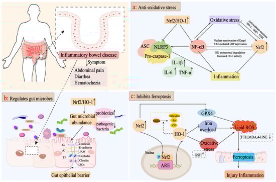 At present, the mainstream view is that the main mechanism of the Nrf2/HO-1 signaling pathway in the treatment of IBD involves controlling oxidative stress and reducing inflammatory damage [,], regulating intestinal microbiota to repair the intestinal mucosal barrier [,], and preventing the ferroptosis of intestinal epithelial cells [,].