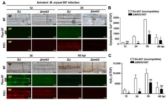 OsMEK2 is required for ROS, iron accumulation, and lipid peroxidation to cause rice ferroptotic cell death []. We investigated cytoplasmic Ca2+ and H2O2 accumulation in rice DJ and ΔOsmek2 mutant rice during avirulent M. oryzae infection at different time points, and the results showed that cytoplasmic Ca2+ and H2O2 were highly accumulated in WT rice DJ during avirulent M. oryzae 007 infection at 36 hpi, compared to that in the ΔOsmek2 mutant rice (Figure 1). Changes in cytoplasmic Ca2+ and H2O2 were analyzed at 12, 24, 36, and 48 hpi in rice DJ and ΔOsmek2 mutant rice during avirulent M. oryzae infection (Figure 1A). In WT rice DJ, cytoplasmic Ca2+ and H2O2 accumulation started from 12–24 hpi and peaked at 36 hpi, however, cytoplasmic Ca2+ and H2O2 accumulation in ΔOsmek2 mutant rice was significantly impaired from 12–36 hpi (Figure 1). The ΔOsmek2 mutant rice showed no expression of the OsMEK2 (Supplementary Figure S1), and had a different disease phenotype during avirulent M. oryzae infection, compared to that in the WT rice DJ (Supplementary Figure S2). We classified the disease phenotypes into IH (invasive hyphae grew inside the rice cell), Type I HR (typical hypersensitive cell death with brown granules filled inside the infected rice cell), and Type II HR (mild hypersensitive cell death with light brown color inside the infected rice cell) (Supplementary Figure S2A). The ΔOsmek2 mutant rice showed a significantly higher HR cell death than WT rice DJ, with the majority of HR cell death being mild HR cell death (Supplementary Figure S2B). To investigate the effects of virulent M. oryzae on cytoplasmic Ca2+ and H2O2 accumulation, we inoculated virulent M. oryzae PO6-6 onto WT rice DJ and ΔOsmek2 mutant rice. Virulent M. oryzae infection induced minor cytoplasmic Ca2+ and H2O2 accumulation in both WT rice DJ and ΔOsmek2 mutant rice, with no significant difference between WT rice DJ and ΔOsmek2 mutant rice (figure in below).