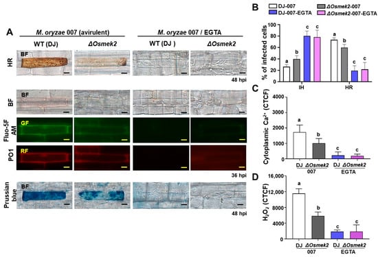 Effects of EGTA on HR cell death, cytoplasmic Ca2+, H2O2 accumulation, and iron accumulation in WT rice DJ and ΔOsmek2 mutant rice during avirulent Magnaporthe oryzae 007 infection. (A) Images of HR cell death, cytoplasmic Ca2+ staining, H2O2 staining, and iron staining in wildtype (WT) rice DJ and ΔOsmek2 mutant rice. Bars = 10 μm. (B) Quantification of different infection types in rice sheath cells of wildtype (WT) rice DJ and ΔOsmek2 mutant rice. IH, invasive hyphae; HR, hypersensitive response. (C) Quantification of cytoplasmic Ca2+ accumulation in rice sheath cells of wildtype (WT) rice DJ and ΔOsmek2 mutant rice. (D) Quantification of cytoplasmic H2O2 accumulation in rice sheath cells of wildtype (WT) rice DJ and ΔOsmek2 mutant rice. Values are means ± SD (n = 3 biological repeats). Different letters above the bar indicated significantly different means, as determined by one-way ANOVA test followed by Tukey’s HSD. SD, standard deviation.