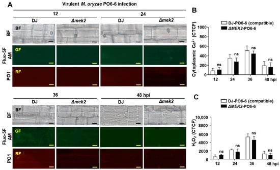 Time-course detection of cytoplasmic Ca2+ and H2O2 accumulation in WT rice DJ and ΔOsmek2 mutant rice during virulent Magnaporthe oryzae PO6-6 infection. (A) Images of cytoplasmic Ca2+ staining by Fluo-5F AM and H2O2 staining by peroxy orange 1 (PO1) in wildtype (WT) rice DJ and ΔOsmek2 mutant rice at 12, 24, 36, and 48 hpi, during virulent M. oryzae PO6-6 infection. Bars = 10 μm. (B) Quantification of cytoplasmic Ca2+ accumulation in rice sheath cells infected with M. oryzae PO6-6 at 12, 24, 36, and 48 hpi. (C) Quantification of cytoplasmic H2O2 accumulations in rice sheath cells infected with M. oryzae PO6-6 at 12, 24, 36, and 48 hpi. Values are means ± SD (n = 3 biological repeats). Data were analyzed by the ANOVA test (mixed-effects analysis) (ns, not significant). SD, standard deviation.