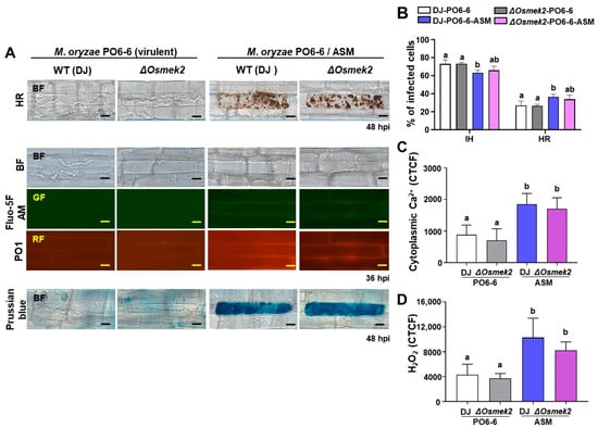 Effects of ASM on HR cell death, cytoplasmic Ca2+, H2O2 accumulation, and iron accumulation in WT rice DJ and ΔOsmek2 mutant rice during virulent Magnaporthe oryzae PO6-6 infection. (A) Images of HR cell death, cytoplasmic Ca2+ staining, H2O2 staining, and iron staining in wildtype (WT) rice DJ and ΔOsmek2 mutant rice. Bars = 10 μm. (B) Quantification of different infection types in rice sheath cells of wildtype (WT) rice DJ and ΔOsmek2 mutant rice. IH, invasive hyphae; HR, hypersensitive response. (C) Quantification of cytoplasmic Ca2+ accumulation in rice sheath cells of wildtype (WT) rice DJ and ΔOsmek2 mutant rice. (D) Quantification of cytoplasmic H2O2 accumulation in rice sheath cells of wildtype (WT) rice DJ and ΔOsmek2 mutant rice. Values are means ± SD (n = 3 biological repeats). Different letters above the bar indicated significantly different means, as determined by one-way ANOVA test followed by Tukey’s HSD. SD, standard deviation.