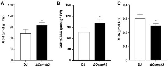 Lipid peroxides (ROOH) are an important class of reactive oxygen species, and lipid peroxidation has been identified as a key downstream feature of ferroptotic cell death []. Lipids are essential for maintaining the integrity of cell membranes, and the peroxidation of lipids could alter the structure, properties, or dynamics of the cell membranes []. Malondialdehyde (MDA), a biomarker for lipid peroxidation in biological samples, is one well-described lipid peroxide degradation product, and the reaction of MDA with thiobarbituric acid could yield a product that can be detected by the spectrophotometer [,]. The MDA content in the ΔOsmek2 mutant rice was less compared to that in the WT rice DJ (Figure 5C), suggesting less peroxidized lipids of the cellular membrane.