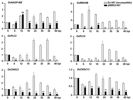 Real-time reverse transcription (qRT-PCR) analysis of time-course expressions of ROS- and calcium-related genes in leaf sheaths of rice DJ and ΔOsmek2 during avirulent Magnaporthe oryzae 007 infection. Relative expression levels of OsNADP-ME, OsRBOHB, OsPLC2, OsPLC4, OsCNGC2, and OsCNGC13 were normalized by the expression of OsUbiquitin (OsUbi). The data represent means ± SD of relative gene expression levels in rice leaf sheaths from three independent experiments. Asterisks above the bars indicate significant differences, as determined by the ANOVA test (mixed-effects analysis) (* p < 0.05, ** p < 0.01; ns, not significant). SD, standard deviation.