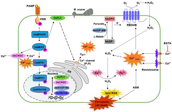 Based on the previous publications and the current data, we proposed a model of the OsMEK2-mediated signaling pathway and its involvement in rice ferroptotic cell death (Figure 7). The mitogen-activated protein kinase (MAPK) pathway is activated through the recognition of the M. oryzae effector by PRRs. In the MAPK signaling cascade, OsMEK2 triggers the OsMPK1-OsWRKY90 pathway in the nucleus, upregulating OsNADP-ME, NADP-oxidase (OsRBOHB), phospholipase C (OsPLC), and cyclic nucleotide-gated channels (OsCNGC). NADP-ME converts L-malate to pyruvate, with NADP+ being converted to NADPH. NADPH gives electrons to RBOHB to promote ROS production. Ca2+ release from the internal stores and Ca2+ influx through the cell membrane are regulated by the PLC signaling pathway and the CNGC channels. The produced ROS and elevated cytoplasmic Ca2+ regulate the downstream immune responses, including iron accumulation and rice ferroptotic cell death. The recently discovered resistosomes are localized on the plasma membrane to facilitate apoplastic Ca2+ influx to mediate rice ferroptotic cell death, while EGTA can chelate apoplastic Ca2+ to prevent Ca2+ influx, as well as the subsequent ROS accumulation, iron accumulation, and the eventual cell death. The plant activator ASM used in this the study stimulates cytoplasmic Ca2+ increase and ROS accumulation through an unelucidated mechanism, contributing to ferroptotic cell death. Further research on the detail mechanism of ASM in the increase of intracellular Ca2+ is necessary to understand ferroptotic cell death and plant immune responses.