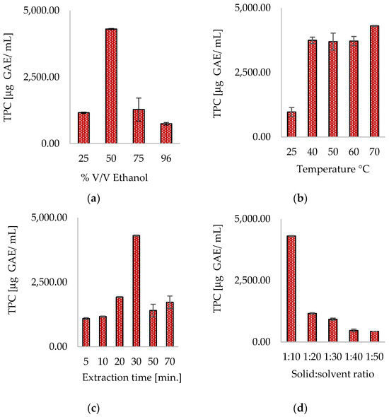Effect on TPC of % ethanol (a), temperature (b), extraction time (c), and solid-to-solvent ratio (d) in ultrasound-assisted extraction at 37 kHz.