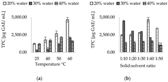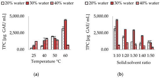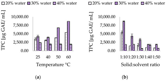 Results comparable to those achieved with ChCl:CA can be observed in experiments involving ChCl:LA, where maximum TPC is obtained under identical extraction conditions utilizing ChCl:CA. In fact, when the STF231 matrix was extracted with a ChCl:LA mixture, the highest yield of 8687.72 ± 127.44 μg GAE/mL was obtained by operating at 60 °C with a solvent-to-matrix ratio of 1:10 and 37 kHz sonication for 60 min, as depicted in Figure 5. Similarly, an increase in water content in the extraction mixture led to an increase in TPC, from 20% to 30% w/v of water, followed by a decrease when the water content reached 40% w/v. The addition of water resulted in a dilution effect, causing a slight decrease in viscosity, which was measured at 69.6 cPs at 20% water, 57.4 cPs at 30% water, and 53.8 cPs at 40% water. The rise in temperature also contributed to an increase in TPC, as observed in ChCl:LA-based NADES, with the maximum reached at 60 °C, as previously mentioned. The solvent-to-matrix ratio exhibited a similar trend as ChCl:CA at 30% w/v water at 60 °C, where the maximum extraction of polyphenols occurred at a ratio of 1:10, followed by a significant decrease with further additions of the extraction mixture. Among the various types of extracting agents studied for the extraction of polyphenols from STF231, it was evident that the combination of lactic acid and choline chloride in a ratio of 5:1 yielded the highest TPC. This finding is supported by several studies in the literature, where lactic acid-based NADES have proven to be superior in terms of extraction efficiency of polyphenols from aromatic plants, particularly when combined with ultrasound treatment [60,61].