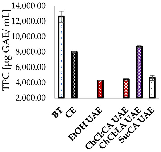 Figure 7 presents a comparison of the TPC of the original bitter tincture with the polyphenol content obtained by using the extraction protocols studied and optimized under the parameters previously reported. As can be seen, hydroethanolic CE and ChCl:LA UAE yielded higher polyphenol content than other proposed methods, with 70.1% and 60.6% recovery of polyphenol content in the original bitter tincture, which contained 12,619.88 ± 715.05 µg GAE/mL. On the other hand, EtOH UAE, ChCl:CA, and Su:CA were less efficient in extracting polyphenols, as the TPC achieved was less than 40% of that of BT.