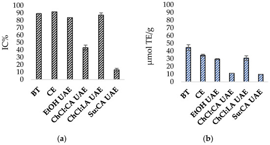 DPPH antioxidant activity (a) and FRAP reducing power (b) of original bitter tincture (BT), conventional hydroethanolic extraction (CE), hydroethanolic ultrasound-assisted extraction (EtOH UAE), choline chloride/citric acid ultrasound-assisted extraction (ChCl:CA UAE), choline chloride/lactic acid ultrasound-assisted extraction (ChCl:LA UAE), and sucrose/citric acid ultrasound-assisted extraction (Su:CA UAE).