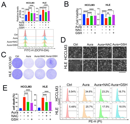 ROS induction is responsible for auraptene-induced cell growth inhibition and cell death. (A) HCCLM3 and HLE cells treated with or without 100 μM auraptene and 5 mM NAC or 5 mM GSH were stained with DCFH-DA for 1 h, followed by flow cytometry analysis. The calculated relative cellular ROS levels (Top) and histogram of flow cytometric pictures are shown (Bottom). (B) The cell viability of HCCLM3 and HLE cells treated with or without 100 μM auraptene, 5 mM NAC, or 5 mM GSH for 24 h was analyzed with CCK-8. (C) HCCLM3 and HLE cells treated with or without 100 μM auraptene, 5 mM NAC or 5 mM GSH for 24 h were stained with crystal violet and the photographs are shown. (D) HCCLM3 and HLE cells treated with or without 100 μM auraptene, 5 mM NAC, or 5 mM GSH for 16 h were photographed and the representative images are shown. Scale bar: 200 μm. (E) HCCLM3 and HLE cells treated with or without 100 μM auraptene, 5 mM NAC, or 5 mM GSH for 16 h were harvested and stained with 10 μg/mL PI followed by flow cytometry analysis. Calculated cell death rate (left) and representative flow cytometric pictures (right) are shown. (A,B,E) Data are represented as the mean ± SD (n = 3); ** p < 0.01, **** p < 0.0001 (one-way ANOVA).