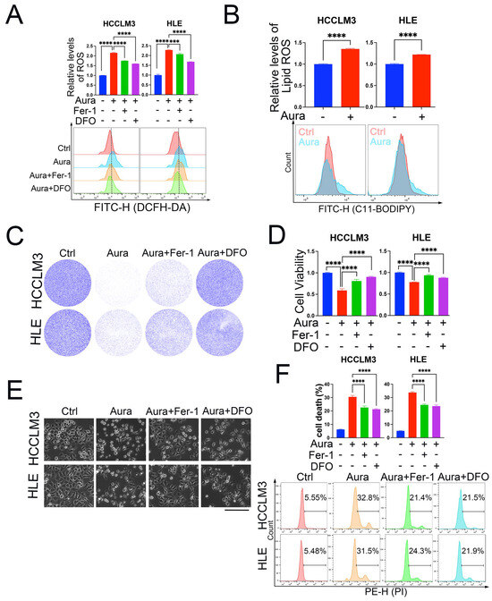 Auraptene induces HCC cell ferroptosis. (A) HCCLM3 and HLE cells treated with or without 100 μM auraptene, 2 μM Fer-1, or 50 μM DFO for 4 h were incubated with the ROS probe DCFH-DA for 1 h followed by flow cytometry analysis. The calculated total ROS levels (Top) and histogram of flow cytometric pictures (Bottom) are shown. (B) HCCLM3 and HLE cells treated with or without auraptene (100 μM) for 10 h were incubated with lipid ROS probe C11-BODIPY 581/591 for 1 h followed by flow cytometry analysis. The calculated lipid ROS levels (Top) and histogram of flow cytometric pictures (Bottom) are shown. (C) HCCLM3 and HLE cells treated with or without 100 μM auraptene, 2 μM Fer-1, or 50 μM DFO for 24 h were stained with crystal violet and photographed; the images are shown. (D) HCCLM3 and HLE cells treated with or without 100 μM auraptene, 2 μM Fer-1 or 50 μM DFO for 24 h were incubated with CCK-8 followed by an analysis with a microplate reader. (E,F) HCCLM3 and HLE cells treated with or without 100 μM auraptene, 2 μM Fer-1 or 50 μM DFO for 16 h were photographed. Scale bar: 200 μm. (E) or stained with PI followed by analysis with flow cytometry. (F) The calculated cell death rate (F, Top) and the representative flow cytometric pictures (F, Bottom) are shown. (A,B,D,F) Data are represented as the mean ± SD (n = 3); *** p < 0.001, **** p < 0.0001 (Unpaired Student’s t test for (B) and one-way ANOVA for (A,D,F)).