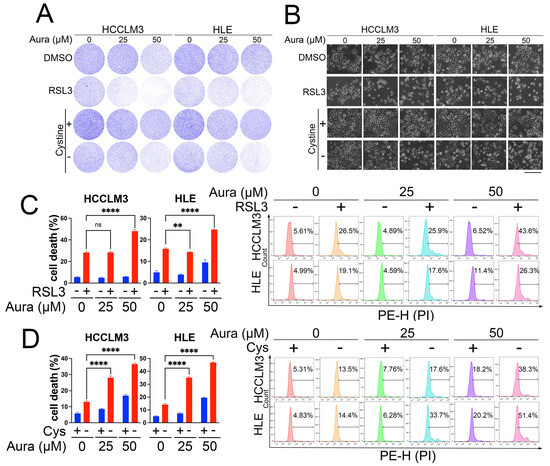 The above data show that a high concentration of auraptene can directly induce HCC cell ferroptosis. A high concentration of auraptene may have side effects when used in clinical trials; therefore, we wanted to evaluate whether a low dose of auraptene can sensitize HCC cells to ferroptosis. The compound RSL3 (RAS-selective lethal small molecule 3) and cystine deprivation are two classical ferroptosis inducers. Therefore, we firstly used different concentrations (less than IC50 value) of an auraptene combination with RSL3 or cystine deprivation treatment to evaluate HCC cell growth inhibition. The colony formation assay showed that treatment with a low concentration of auraptene can increase the cell growth inhibition mediated by RSL3 or cystine deprivation (Figure 4A). Consistent with these results, treatment with a low concentration of auraptene can significantly increase RSL3- or cystine deprivation-induced HCC cell death (Figure 4B,D). Overall, these results reveal that a low auraptene concentration can sensitize HCC cells to ferroptosis, so a combination of auraptene with classical ferroptosis inducers may be a promising strategy for HCC treatment.