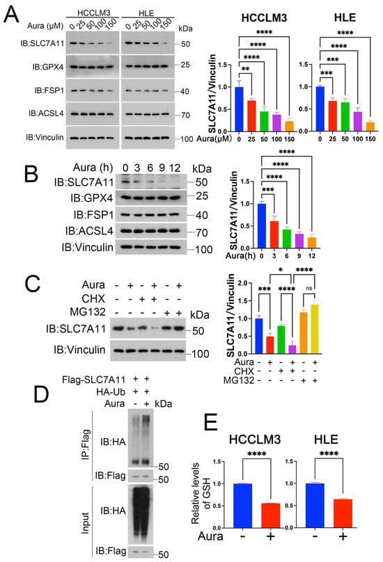 Auraptene degrades SLC7A11. (A) HCCLM3 and HLE cells treated with indicated concentrations of auraptene for 10 h were harvested for WB analysis with indicated antibodies, with Vinculin as the loading control. (B) HLE cells treated with 100 μM auraptene at the indicated time points were harvested for WB analysis with indicated antibodies, with Vinculin as the loading control. (C) HLE cells were pretreated with 100 μM auraptene for 2 h and then treated with or without CHX (100 μg/mL) or MG132 (10 μM) for another 8 h, then cells were harvested for WB analysis with indicated antibodies. (A–C) The data of SLC7A11/Vinculin are represented as the mean ± SD (n = 3); ns: no significance, * p < 0.05, ** p < 0.01, *** p < 0.001, **** p < 0.0001 (one-way ANOVA). (D) HLE cells were transfected with the specified plasmids for 15 h and then treated with or without 100 μM auraptene for 10 h. Cells were lysed for immunoprecipitated with anti-flag antibodies followed by Western blotting with the specified antibodies. (E) HCCLM3 and HLE cells were treated with or without 100 μM auraptene for 10 h and the cellular GSH levels were determined by a microplate reader at 412 nm. Data are represented as the mean ± SD (n = 3); **** p < 0.0001 (Unpaired Student’s t test).