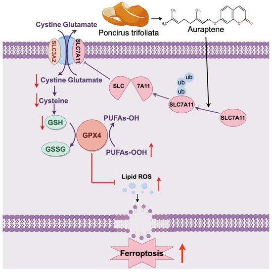 In this study, we focused on the effects of auraptene on HCC cells and found that auraptene induces HCC cell death via the ferroptosis pathway. Mechanistically, auraptene treatment inhibits SLC7A11 expression, and this inhibition can be eradicated by the addition of the ubiquitin–proteasome inhibitor MG132 instead of the protein synthesis inhibitor chlorhexidine (CHX). Moreover, auraptene treatment increases the poly-ubiquitination level of SLC7A11, implying that auraptene targets SLC7A11 for ubiquitin–proteasomal degradation in HCC cells. However, the specific ubiquitin E3 ligase or deubiquitinase involved in auraptene-induced SLC7A11 degradation needs to be explored in the future. Furthermore, SLC7A11 degradation leads to the decline of GSH and imbalance of cellular redox characterized by total ROS and lipid ROS accumulation, eventually resulting in ferroptosis and growth inhibition of HCC cells (Figure 6). Intriguingly, a low dose of auraptene can sensitize HCC cells to ferroptosis, implying the possibility of using auraptene alone or in combination with other ferroptosis inducers for cancer treatment. Although we found that auraptene targets SLC7A11 for ubiquitin–proteasomal degradation, the detailed molecular mechanism remains to be further studied.