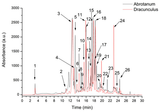 HPLC chromatogram of phenolic compounds from A. abrotanum and A. dracunculus ethanolic extracts. The peak identification is provided in Table 2.
