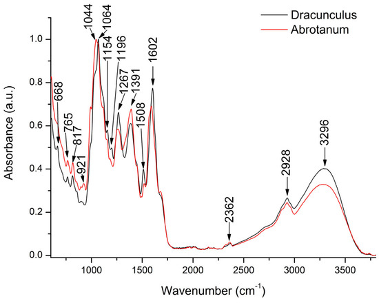Comparative general FTIR spectra of A. dracunculus and A. abrotanum ethanol extracts (600–3500 cm−1).