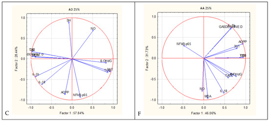 Treatment with AD 100% and AD 50% lowered TOS and OSI (p < 0.001) by causing an important reduction in 8-OhdG, NO, and 3NT (p < 0.001) and a moderate decrease in AOPP (p < 0.01) and MDA (p < 0.01). AD 25% caused the reduction in 8-OHdG, 3NT (p < 0.001), and MDA (p < 0.05). TAC and SH were not influenced by AD 100%, AD 50%, or AD 25%. Diclofenac’s antioxidant effect was better than that of AD only on 8-OHdG and MDA. AD dilutions were less effective than TX on TOS, OSI, MDA, and NO (Table 4).