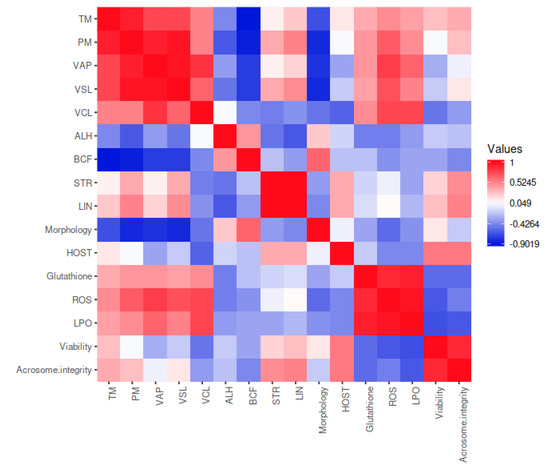 A high positive correlation was described between VSL and VAP (+0.949), LIN and STR (+0.911), VSL and PM (+0.864), LPO and ROS (+0.808), VAP and PM (+0.806), TM and PM (+0.795), VAP and VCL (+0.780), ROS and glutathione (+0.739), and LPO and glutathione (+0.704). In contrast, there was a negative correlation between yjr BCF and TM (−0.467), viability and ROS (−0.432), BCF and PM (−0.412), acrosome integrity and LPO (−0.411), viability and LPO (−0.381), VAP and BCF (−0.375), and STR and VCL (−0.375).
