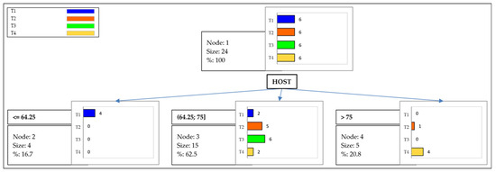 The data mining CHAID DT obtained from the chi-square dissimilarity matrix is represented in Figure 2. The distribution between the branches and nodes suggested significant differences between treatments for the HOST variable, classifying the observations into three groups (≤64.25, 64.25–75, >75). The HOST variable defined the terminal node and gave rise to leaf nodes. Considering the 24 samples used in the study, only 5 of them had HOST values above 75. Of these five samples with a value above 5, four of them corresponded to T4. Therefore, T4 obtained four samples with HOST values greater than 75 and two with values between 64.25 and 75.