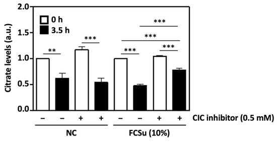 Cytosolic citrate is consumed in the process of human sperm capacitation. Spermatozoa incubated in non-capacitating conditions (NC) for 3.5 h at 37 °C in BWW-NES exhibit decreased citrate levels compared to samples at 0 h. In samples containing the capacitation inducer FCSu, the presence of 0.5 mM CIC inhibitor leads to decreased citrate consumption after 3.5 h when compared to samples incubated in FCSu alone. The results were obtained with sperm samples from different healthy donors. Citrate levels are expressed in arbitrary units (a.u.) ± SEM and normalized to the NC or FCSu controls at 0 h, representing two distinct groups (** p ≤ 0.01, *** p ≤ 0.001, ANOVA and Tukey’s test, n = 6).