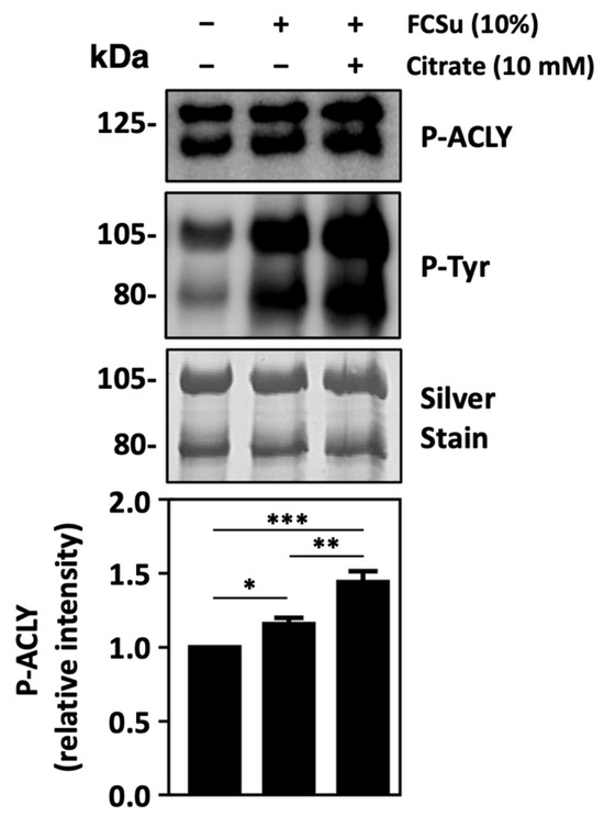 ATP-citrate lyase is activated during human sperm capacitation. Phospho-ATP-citrate lyase (P-ACLY) levels reveal increased ACLY activation in spermatozoa incubated in BWW-REG with the capacitation inducer FCSu, which is further increased in the presence of 10 mM citrate. Levels of P-ACLY are consistent with tyrosine phosphorylation patterns in the same samples. The results were obtained with sperm samples from different healthy donors. Relative intensities are expressed as mean ± SEM (* p ≤ 0.05, ** p ≤ 0.01, *** p ≤ 0.005 ANOVA and Tukey’s test, n = 6).