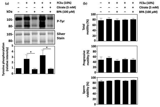 Each prepared human sperm sample was supplemented with electrophoresis sample buffer containing 100 mM dithiothreitol (DTT) and phosphatase inhibitors (0.1 mM sodium vanadate, 20 mM glycerol phosphate, and 5 mM sodium fluoride). Samples were then heated at 97 °C for 5 min and centrifuged at 21,000× g for 5 min at room temperature. The supernatant of each sample was loaded into a 10% polyacrylamide gel, electrophoresed, and electrotransferred onto a nitrocellulose membrane. The membranes were blocked for 1 h with 5% skim milk in Tris-buffered saline with Tween 20 (TTBS 1X), followed by overnight incubation at 4 °C with either anti-phosphotyrosine or anti-phospho-ATP-citrate lyase primary antibodies (1:10,000 and 1:500, respectively) in antibody buffer (TBS 1X, 0.1% Tween 20, 25 mg/mL BSA, and deionized water). Following primary antibody incubation, the membranes were washed 5 times for 10 min in TTBS 1X and incubated for 1 h in either goat anti-mouse or donkey anti-rabbit secondary antibodies (diluted at 1:2500 in TTBS 1X) at room temperature. Once the secondary antibody was removed, the membranes were washed 5 times for 10 min in TTBS 1X and soaked in ECL solution (luminol enhancer and peroxide) for 5 min. Imaging was carried out using the Amersham Imager 600 supplied by GE Healthcare (Montreal, QC, Canada). The relative intensity of each protein band was determined using Image J software version 2.1.0/1.53c (National Institutes of Health, Bethesda, MD, USA), standardized to the corresponding band on the silver-stained membrane, and normalized to the respective control.