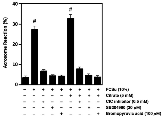 Sperm samples were capacitated with FCSu at 37 °C for 3.5 h in BWW-REG following treatment with 0.5 mM CIC inhibitor, 30 μM SB204990 (ACLY inhibitor), or 100 μM bromopyruvic acid (ME inhibitor) in the presence and absence of citrate. Samples were then centrifuged for 5 min at 600× g, and the pellet was resuspended in fresh BWW medium containing 10 μM progesterone upon incubation at 37 °C for 30 min to induce the acrosome reaction [41]. Each sample was centrifuged for 5 min at 600× g, and the pellet was fixed in 95% ethanol. Samples were smeared on a Superfrost microscope slide, air dried, and incubated 30 μg/mL PSA-FITC at 37 °C for 5 min. Slides were washed and covered with a coverslip, and the percentage of reacted acrosomes among 200 spermatozoa was determined using a Leica DMI6000 microscope (Leica Microsystems, Wetzlar, Germany).