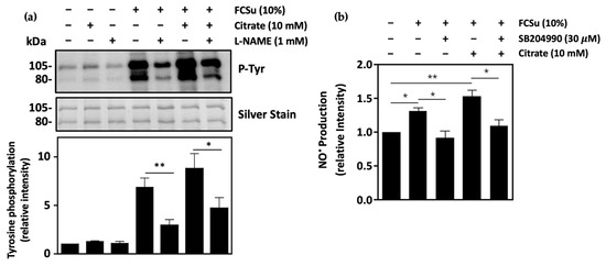 To elucidate whether NO● synthesis occurs in citrate-mediated capacitation, spermatozoa capacitated with FCSu were supplemented with 1 mM L-NG-Nitro arginine methyl ester (L-NAME), with or without 10 mM citrate. L-NAME is a competitive inhibitor of NOS previously reported to decrease capacitation in mammalian spermatozoa [20,42]. Here, the incubation of spermatozoa in L-NAME resulted in a significant decrease in tyrosine phosphorylation in the presence and absence of citrate, validating the need for NO● in sperm capacitation (Figure 8a). The same effect of L-NAME on sperm capacitation was observed in spermatozoa incubated in BWW-NES (Supplementary Figure S4).