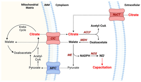 Cytosolic citrate metabolism promotes NO● production in capacitating human spermatozoa. Extracellular citrate can enter the cytosol through carriers such as the sodium-citrate cotransporter (NaCT), and mitochondrial citrate can be transported to the cytosol via the mitochondrial citrate transporter (CIC). Cytosolic citrate is then converted to acetyl-CoA and oxaloacetate via ATP-citrate lyase (ACLY). The oxaloacetate produced is converted by malate dehydrogenase (MDH) to yield malate, which is then converted by the malic enzyme (ME) to NADPH and pyruvate. Pyruvate can re-enter the mitochondrion via the mitochondrial pyruvate carrier (MPC) to continue energy production through the Krebs cycle. NADPH can be used by cytosolic nitric oxide synthase (NOS) to yield nitric oxide (NO●) to promote sperm capacitation. Created with BioRender.com (accessed on 8 June 2024).