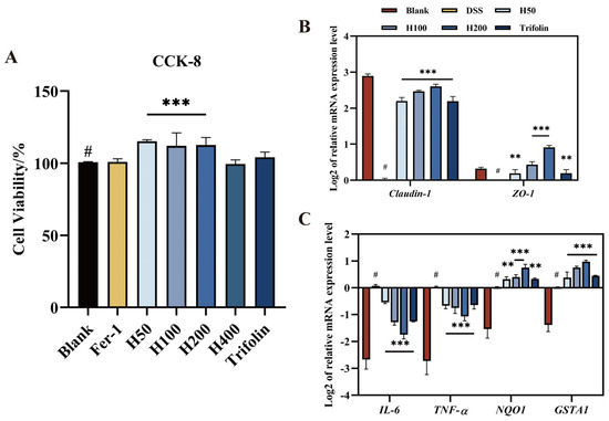 Effects of different treatments on Caco-2 cell viability, tight junction cytokines, and inflammation factors in DSS-induced Caco-2 cells. (A) Effect of the L. bicolor honey extract (50, 100, 200, and 400 μg/kg), Fer-1 (10 μM), and Trifolin (10 μM) on the cell viability of Caco-2 cells. (B) Effect of the L. bicolor honey extract (50, 100, and 200 μg/kg) and Trifolin (10 μM) on the mRNA expression of the tight junction genes Claudin-1 and ZO-1 in DSS-induced Caco-2 cells. (C) Effect of the L. bicolor honey extract (50, 100, and 200 μg/kg) and Trifolin (10 μM) on the mRNA expression of the inflammation genes IL-6, TNF-α, NQO1, and GSTA1 in DSS-induced Caco-2 cells. ** p < 0.01, *** p < 0.001 compared with ‘#’, representing the Blank group.