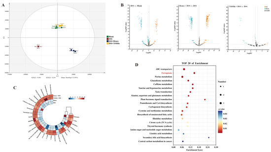 Effects of different treatments on cellular metabolites in DSS-induced Caco-2 cells. (A) Partial least squares discrimination analysis (PLS-DA) based on the metabolites of Caco-2 cells among Blank, DSS, 100 μg/kg Honey + DSS, and 10 μM Trifolin + DSS groups (n = 4 for each group). (B) Volcano plot based on the differential metabolites of Caco-2 cells among DSS vs. Blank, 100 μg/kg Honey + DSS vs. DSS, and 10 μM Trifolin + DSS vs. DSS. (C) Log2 value of differential metabolites based on p value < 0.05, VIP ≥ 1 from PLS-DA, and FoldChange ≥ 2 or ≤0.5 from the volcano plot among each group. (D) Top-20 metabolic pathway mappings with KEGG databases based on FoldChange ≥ 2 or ≤0.5 for the difference in metabolites among each group.