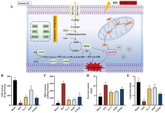 (A) Schematic diagram of the mechanism of ferroptosis in DSS-induced human Caco-2 cells through the Nrf2/HO-1 pathway. Effects of different treatments on oxidative stress in DSS-induced Caco-2 cells. Content of (B) SOD, (C) MDA, (D) free iron, and (E) GSH/GSSG ratio in DSS-induced Caco-2 cells. a, b, c, and d indicate significant differences (p < 0.05). The groups containing differently labeled letters indicate significant differences (p < 0.05). The groups with the same letter labeled exhibit no significant differences.