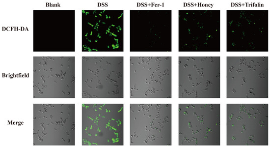 One characteristic of ferroptosis is the imbalance between the generation and degradation of lipid ROS in cells [38]. This imbalance is primarily caused by the excessive accumulation of intracellular iron-dependent ROS and the reduced scavenging effect of GPX4 [42]. When the antioxidant capacity of cells decreases and becomes insufficient to remove the excessive accumulation of lipid ROS, ferroptosis occurs [38]. To evaluate this, we measured intracellular ROS levels. As depicted in Figure 4, fluorescence intensity was significantly higher in the DSS group compared to the Blank group, indicating activation of ferroptosis in Caco-2 cells under DSS induction. However, fluorescence intensity markedly decreased following pretreatment with 10 μM Fer-1, 100 μg/kg L. bicolor honey extract, and 10 μM Trifolin. This suggests that these treatments can inhibit lipid oxidation and reduce ROS levels, thereby regulating ferroptosis and mitigating the inflammatory response induced by DSS.