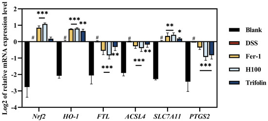 L. bicolor honey and Trifolin prevents ferroptosis by Nrf2/HO-1 pathway in DSS-induced Caco-2 cells. Effect of L. bicolor honey extract (100 μg/kg), Fer-1 (10 μM), and Trifolin (10 μM) on mRNA expression of the relative genes for Nrf2/HO-1 and the ferroptosis pathway, including Nrf2, HO-1, FTL, ACSL4, SLC7A11, and PTGS2 in DSS-induced Caco-2 cells. * p < 0.05, ** p < 0.01, *** p < 0.001 compared with ‘#’, representing the Blank group.