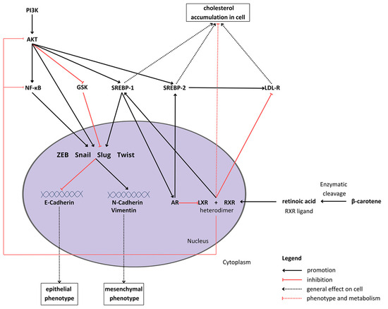 BC metabolism consists of enzymatic conversion to retinoic acid, which binds to various receptors, such as the retinoid X receptor (RXR) [22]. The intracellular metabolic and proliferation pathways form a complex network of multidirectional connections between BC and the EMT process (what is depicted in Figure 1). For example, one of the sterol regulatory element-binding proteins (SREBPs), SREBP1, which is activated by Akt [23], raises cellular steroids levels [24]. Duanyang and colleagues showed that it also activates Snail in colorectal cancer [25]. The liver X receptor (LXR) decreases cholesterol accumulation in cells [26] by promoting its efflux and inhibiting the low-density lipoprotein receptor (LDL-R) [27]. Additionally, it suppresses Akt and nuclear factor-κB (NF-κB) signaling, responsible for proliferation and the inflammatory state, respectively [28,29]. However, LXR stimulates SREBP-1c expression [30], therefore potentially inducing the activity of the SREBP-1c/AR/SREBP-2 axis [26,31]. Carotenoids, such as lycopene, have been proven to reduce androgen-dependent AR nuclear translocation. Although they do not inhibit AR directly, they might pose antiandrogenic properties, inhibiting the expression and activity of AR [32]. However, carotenoids have not been extensively studied in the context of androgen signaling and its crosstalk with the EMT process.