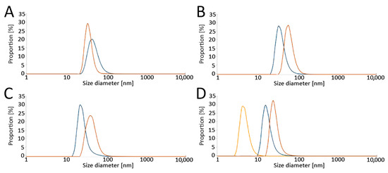 The size distribution of the obtained LPs was determined by a Zetasizer Nano ZS Instrument (A.P. Instruments, Warsaw, Poland) using dynamic light scattering (DLS). Samples were measured at 25 °C with 173° scattering. The results are presented as number-based distributions (Figure 2).