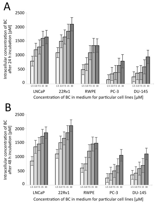 The uptake of BC in the studied cell lines depending on the BC concentration and time of the treatment. The concentration of BC used in further experiments was 3 µM. Whiskers represent the standard error of n = 3 replicates. Intracellular concentration of BC after 24 h (A) and 48 h (B) incubation (pM). Abbreviations: BC—β-carotene.