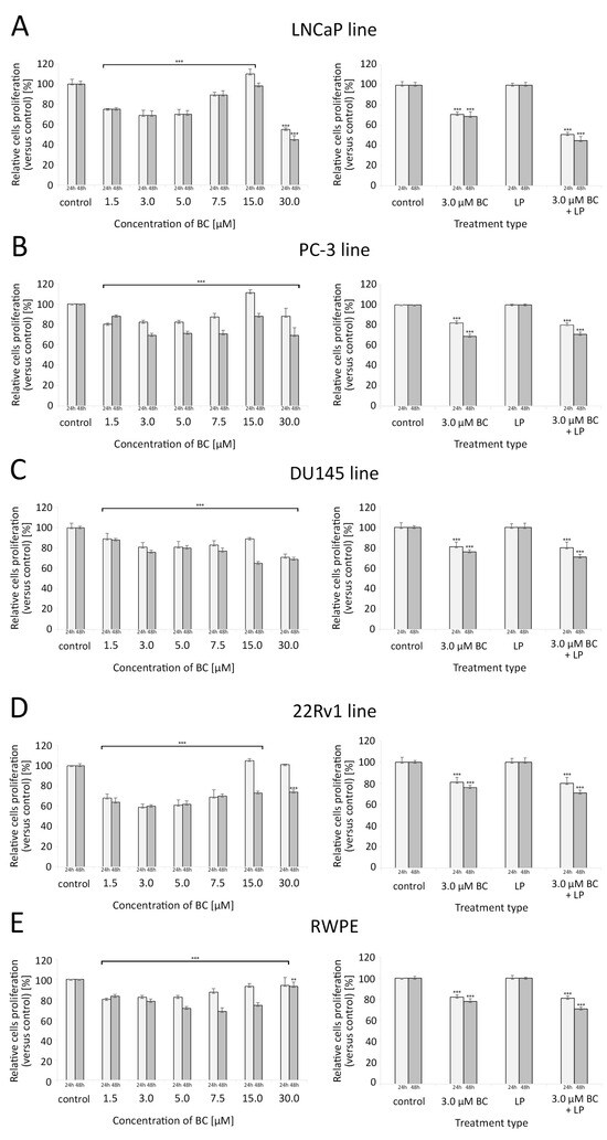 In all cell lines, exposure to 3 µM BC (with or without LP) caused a significant reduction in the proliferation rate, and this effect was more pronounced after a longer incubation time. LP-BCs were associated with a stronger decrease in proliferation levels than BC alone in the LNCaP and 22Rv1 cell lines (p < 0.001). For further details, please see Figure 5.