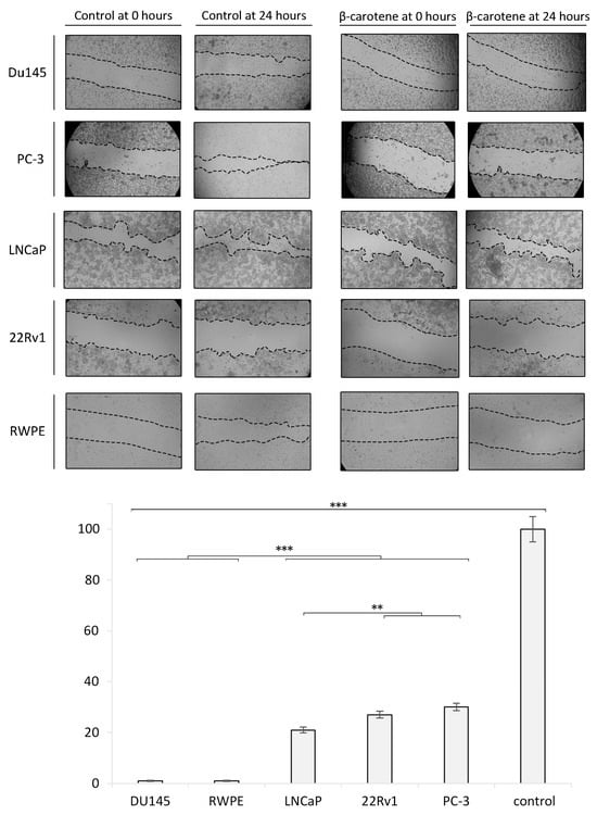 The migratory effect was confirmed to be decreased in our study, as is summarized in Figure 6. Similar results were observed for other carotenoids, such as lycopene [58], which was able to suppress migration in PC3 and Du145 cells. It is worth mentioning that, in both our and the cited study, low concentrations of carotenoids, which can be easily achieved in human plasma, have an ability to reduce the migratory potential.