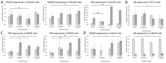 The relative gene expression levels measured with the RT-qPCR method with reference to the control samples after 24 h and 48 h. The histogram values are a quantitative representation of data (mean ± SD) from three independent experiments. (A) DU145 line, (B) PC-3 line, (C) RWPE line, (D) LNCaP line. Statistically significant differences are denoted with asterisks (* for p < 0.05 ** for p < 0.01, and *** p < 0.001). Only results with at least one statistically significant difference between samples are presented for the clarity of data presentation. Abbreviations: AR—androgen receptor; HMGCR—3-hydroxy-3-methyl-glutaryl-coenzyme A reductase; PI3K—phosphoinositide 3-kinase; SREBP—sterol regulatory element-binding protein; TNF-α—tumor necrosis factor-α.